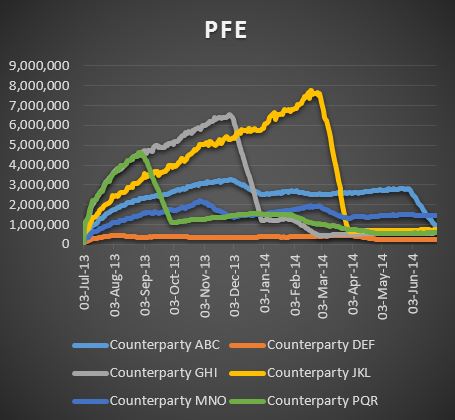 Using our PFE system, any time horizon can be specified and several years is standard. Netting agreements affecting the positions and trades are applied to the calculation. A netting agreement is a legally binding contract which indicates whether the debt of a given company to a counterparty can be offset by debts of the counterparty to the company.
